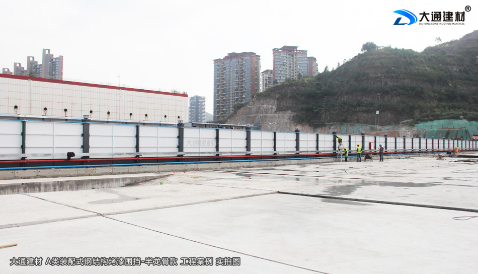 大通建材A類烤漆鋼圍擋-半龍骨款,是一款新型裝配式鋼結構圍擋,圍擋的上下橫梁均為50x50mm深灰色烤漆方通,立柱為300x200mm深灰色烤漆矩形方鋼,2.5米高的每一擋圍擋有8塊(6塊白色、2塊深灰色)烤漆墻板,由左右兩塊墻板與中間暗柱、左右立柱連接組成,安裝得當可以防御10級以上的臺風。了解更多“大通建材A類烤漆鋼圍擋-半龍骨款”的定制生產、配送安裝、價格與規格等詳情,請直接致電13826562448梁先生 進行溝通