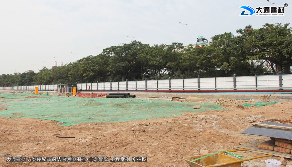 廣東省深圳市南山區前海路的棉山路至媽彎大道段工程項目使用了大通建材生產銷售的A類烤漆鋼圍擋2.5米高半龍骨款、圍擋基礎塊、標準工地大門等產品