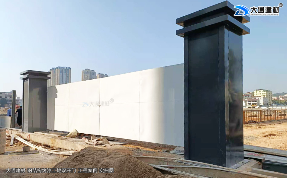 這個建筑工地大門采用的是深圳大通建材生產(chǎn)的項目施工現(xiàn)場的鋼結(jié)構(gòu)烤漆工地雙開門,白色烤漆鋼材制作,雙開門加兩根霸氣大立柱,整個大門看起來很有氣勢
