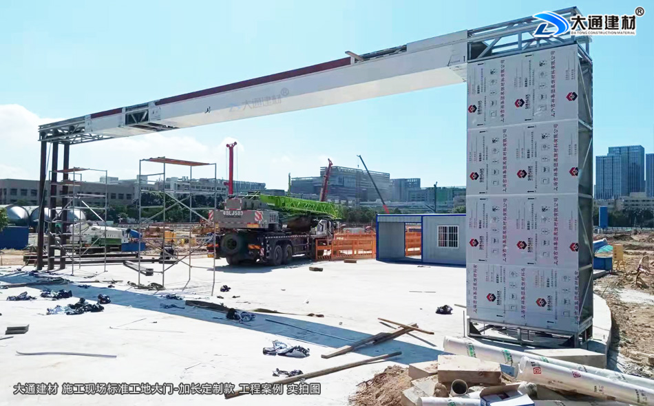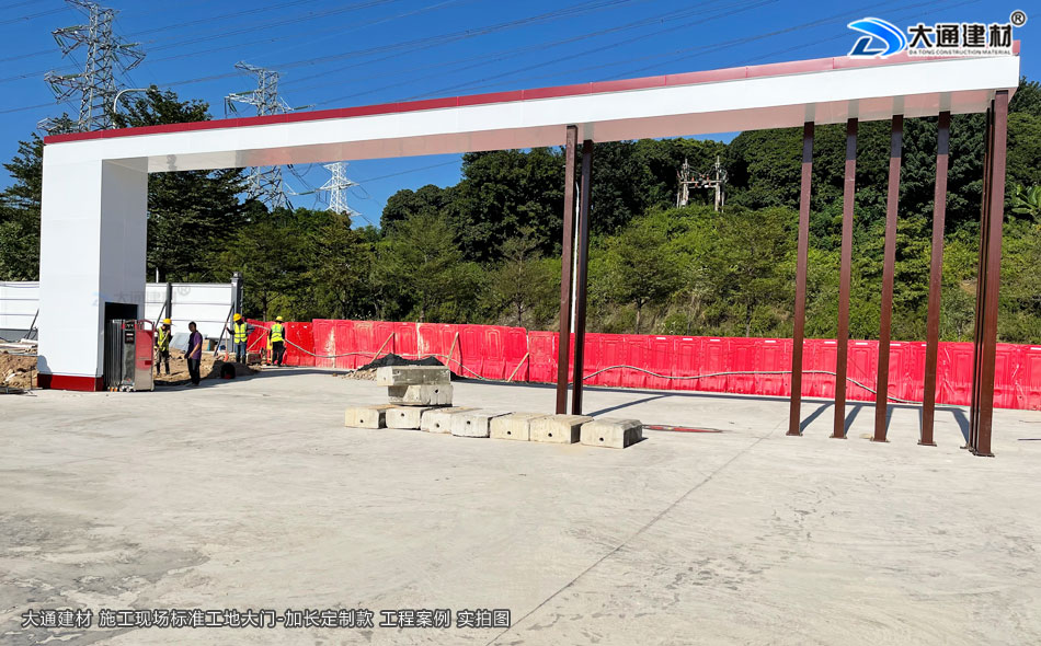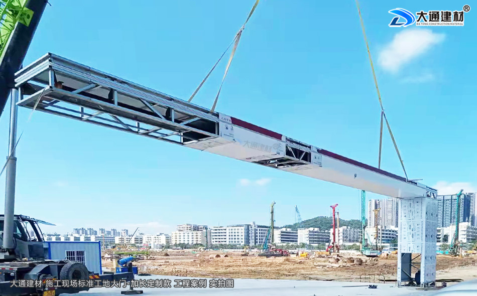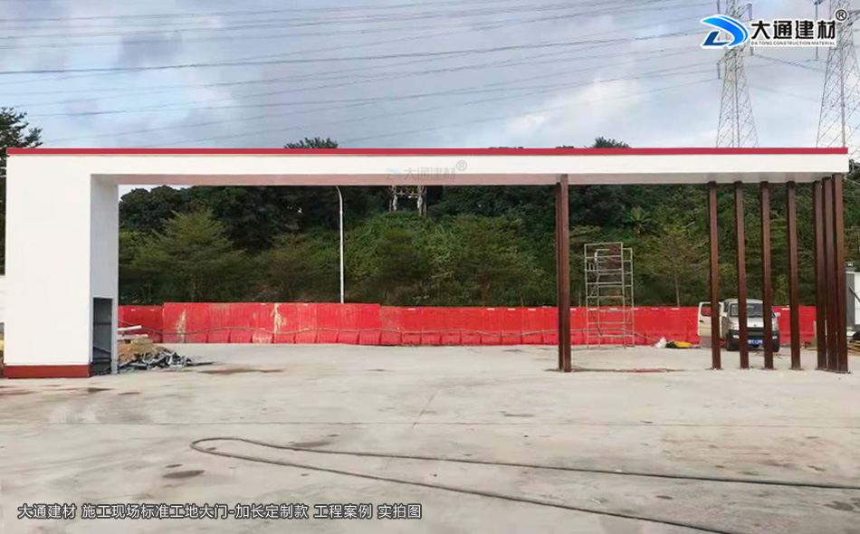 深圳市大通建材有限公司提供標準工地大門生產(chǎn)定制/配送安裝等服務(wù),標準工地大門常規(guī)尺寸為14800mm*5600MM,一些項目工程有特殊需求的可以根據(jù)實際需求進行定制化生產(chǎn),如下面展示的這款鋼結(jié)構(gòu)標準工地大門定制加長款的尺寸是16800mm*5600MM,其它尺寸工地大門有需求的亦可定制化生產(chǎn)。