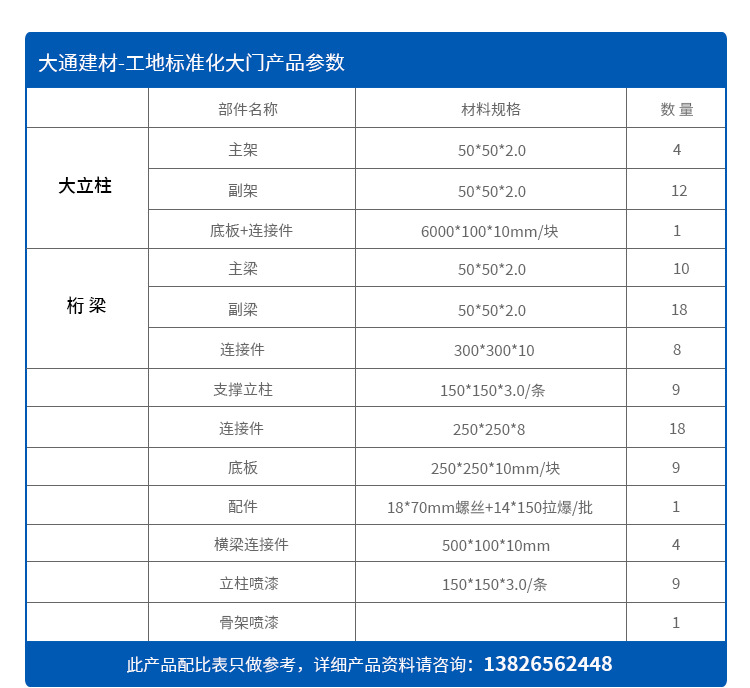 深圳市大通建材有限公司生產(chǎn)批發(fā)的施工現(xiàn)場(chǎng)標(biāo)準(zhǔn)工地大門,符合市政標(biāo)準(zhǔn)、美觀環(huán)保、安全穩(wěn)固,大通建材建筑工地大門常規(guī)尺寸有現(xiàn)貨,亦可按實(shí)際需求定制生產(chǎn)。了解更多關(guān)于 標(biāo)準(zhǔn)工地大門 規(guī)格、價(jià)格等詳情請(qǐng)致電 梁先生13826562448 感謝您的信賴與支持 期待與您的合作!