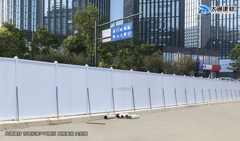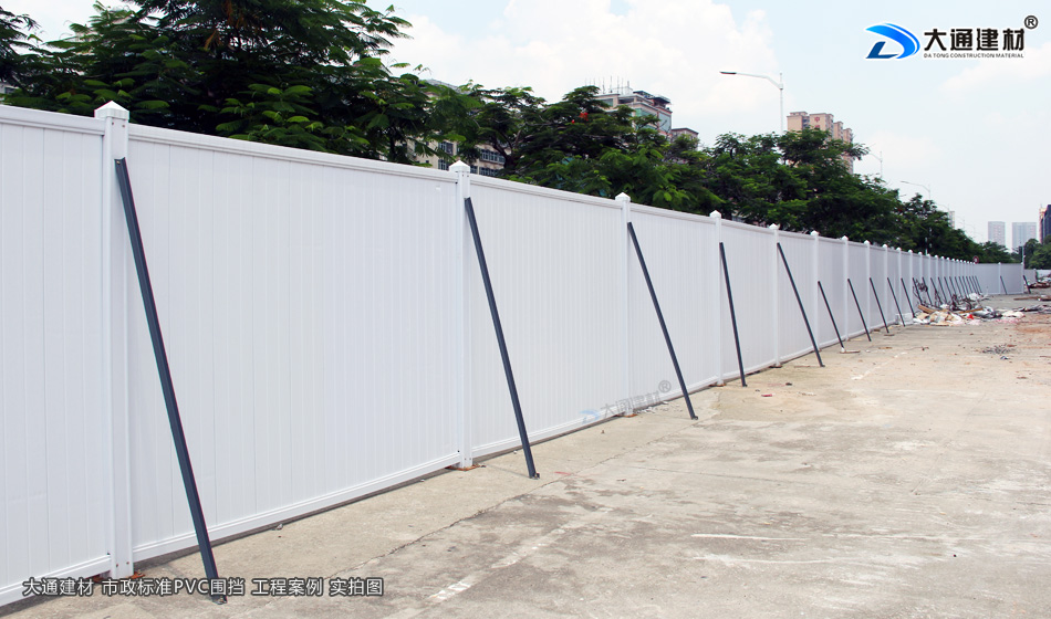 大通建材市政工程PVC圍擋的圍墻板采用白色PVC長條版拼接,而立柱、橫管均為白色PVC材料,內部均襯塑鋼方通,立柱底板為鋼板,機動靈活,快速拆裝,簡單快捷牢固,經濟實用、成本低; 并加斜支撐,增加受力,承載力大、抗風阻系數高、穩定性強。非常適用于市政建設施工、房地產項目施工、高架橋施工、地地鐵項目施工、路橋維護施工、隧道施工、立面改造施工、廠房隔斷施工等工程。