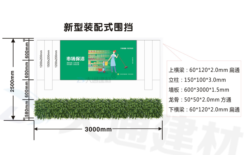 深圳市大通建材生產的 新型裝配式圍擋+高檔綠植圍擋 符合深圳市住建局統一要求的圍擋標準,常規尺寸的圍擋有現貨,而對圍擋尺寸、顏色等有特殊要求的可按實際需求定制化生產,了解更多“大通圍擋規格與價格”的詳情請致電咨詢 13826562448 梁先生