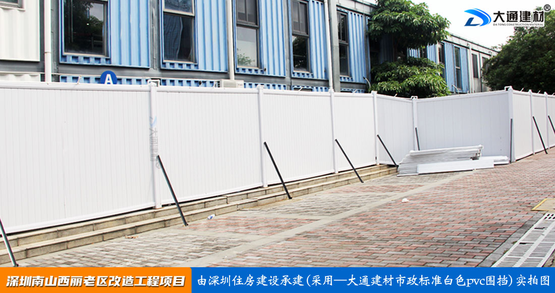 深圳市大通建材生產(chǎn)批發(fā)的市政標(biāo)準(zhǔn)PVC圍擋的圍擋墻板采用PVC長條版拼接,立柱、橫管均為PVC材料,內(nèi)部均襯方通。立柱底板為鋼板,并加斜撐受力,來保證PVC圍擋抗風(fēng)力更強(qiáng)、更安全穩(wěn)固。大通建材常規(guī)款PVC圍擋尺寸長3mx高2.5m、長3mx高2.2m、長3mx高2m 其它PVC圍擋尺寸可按實(shí)際需要進(jìn)行定制生產(chǎn)。