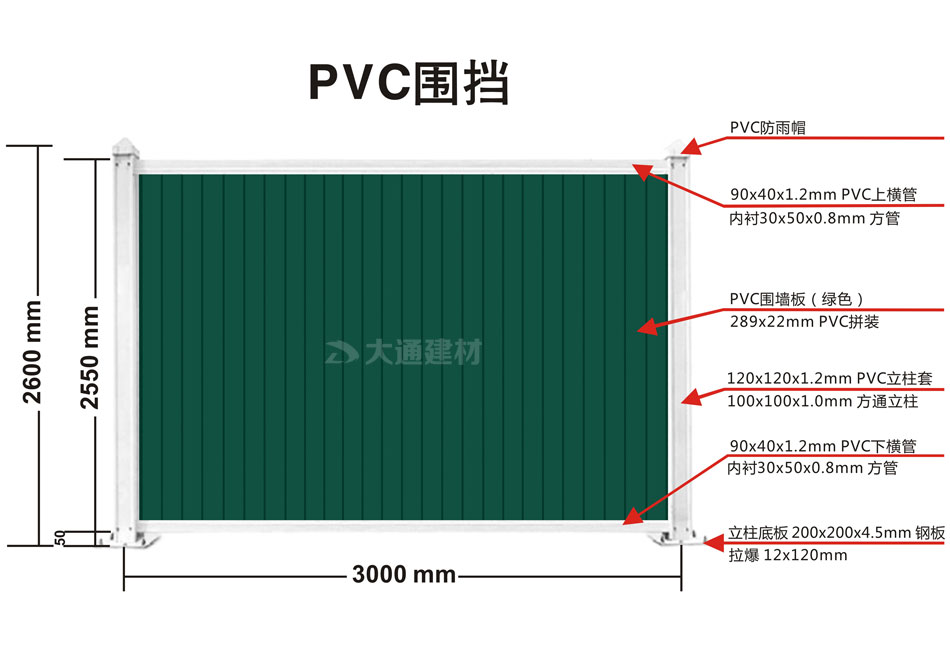 深圳市大通建材推出的這款綠色pvc圍擋的長3米,高2.5米,圍擋墻板是綠色PVC長條版拼接,立柱、橫管均為白色PVC材料,內(nèi)部均襯塑鋼方通,立柱底板為鋼板,并加斜支撐,增加受力,確保更安全穩(wěn)固。